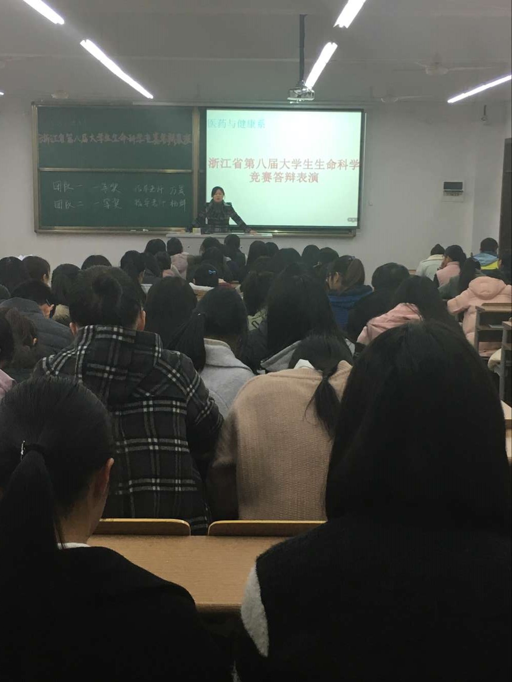 同时本次宣讲会邀请到了第八届生命科学竞赛荣获一等奖的两个团队,首先上台的是胡晓莉同学代表团,她为我们讲述了她的答辩内容:功能性生物发酵食品――水果酵素的制备及其抗氧化性能研究,主要讲解了对水果抗氧化性能的评价和比较,然后胡春霞老师就抗氧化性发出提问,和同学们展开激烈讨论,在场学生都认真听讲,积极思考。其次是张佳城同学代表团,她的答辩内容是:道地药材浙贝母配方颗粒的研制及其质量研究。她主要向我们讲述了她们团队在研究过程中遇到的问题及解决方法。最后,胡春霞老师就生命科学竞赛的注意事项、参赛规则、主要流程做简单说明,着重强调诚信问题,并希望有兴趣的同学积极参加。