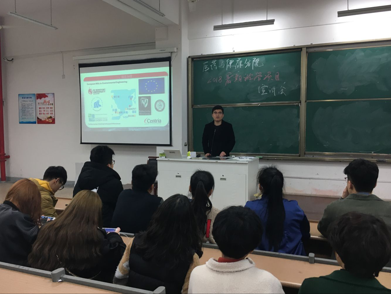 2018年3月19日晚,医药与健康分院在教学楼1-207举办了关于2018年暑期出国访学交流项目宣讲会。2017级药学和护理专业全体学生参加了本次宣讲会。
