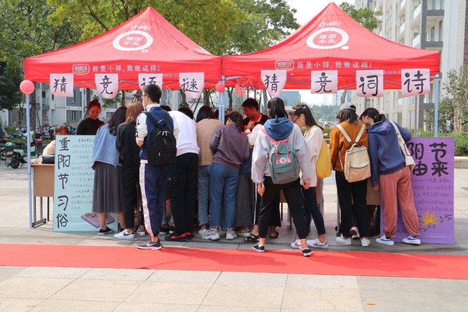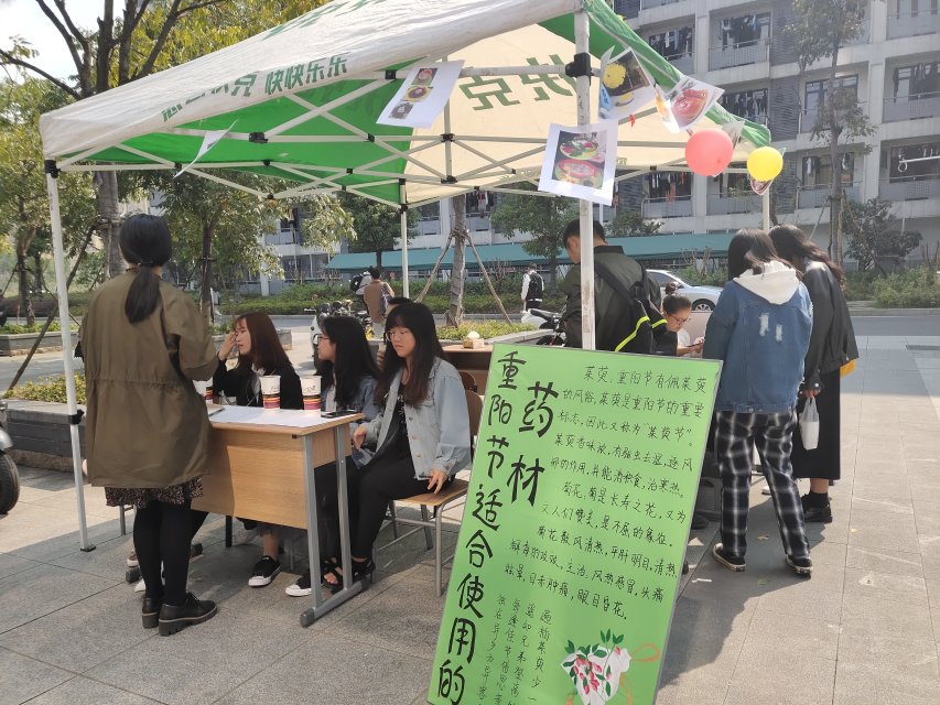 分院学生党员和药创社成员在北区食堂开展了“重阳节健康养生宣传活动”,通过重阳节字谜游戏、诗词有奖竞猜、秋季药材功效宣传等多种形式的活动,向学院广大学子宣传重阳节历史文化和养生习俗,传播了医药健康知识。