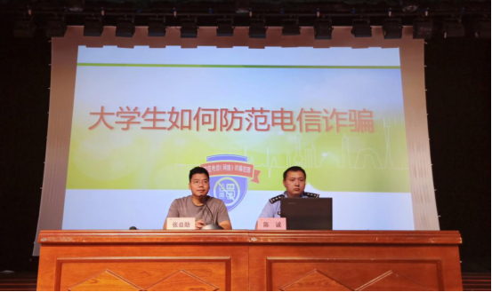 陈所长结合发生在生活中的典型案例,向在座的2019级新生们普及诈骗分子的惯用作案手法,如网络贷款、QQ诈骗、虚假中奖、冒充身份等,警示学生要提高自我防范意识,时刻保持头脑清醒。同时,对大学生如何防范电信诈骗进行详细讲解,提醒学生不向对方透露自己及家人的隐私信息,不轻信不法分子的危言耸听,不向陌生人汇款、转账等,在遇到不能准确判断的情况时,要及时主动向派出所报案等。