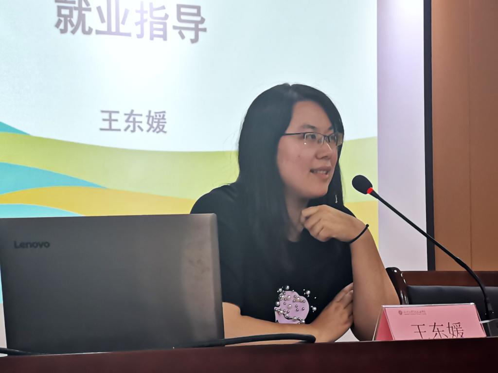 紧接着,王东媛老师对在座学生进行就业指导分析,指出用人单位与毕业生需求之间的不平衡,学生应把握就业节奏,并提出了相关问题引发学生深思。她还重点阐述了毕业生应了解用人单位招聘信息,并且从简历、面试、笔试等方面进行认真准备,同时也调到要在平时注重职业素养与专业技能的提升。
