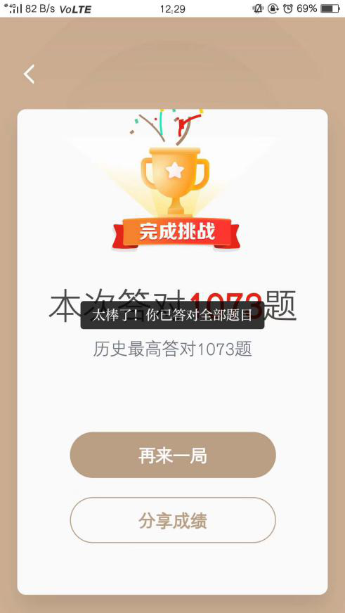 就这样,172题,456题……功夫不负有心人,赵文胜的成绩节节攀升,终于在11月21日,他完成了“学习强国”挑战答题栏目1073题的首次通关,平均每道题目耗时2.89秒。赵文胜同学的挑战答题战绩在老师和同学之间广为流传,大家赞叹不绝。“学无止境,习以为常,强识博闻,国而忘家”——大家这么评价他。