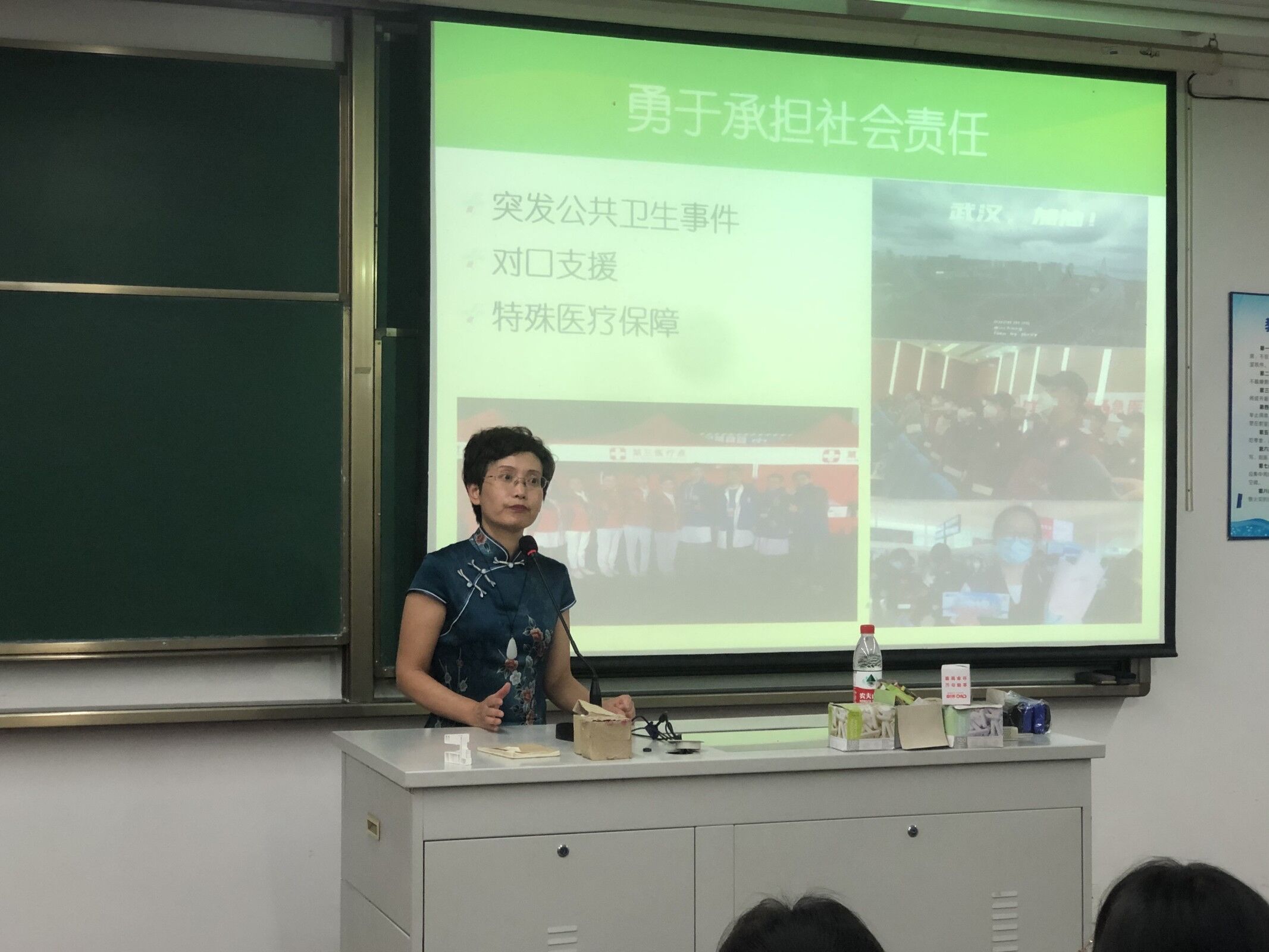 马红丽主任以“护理有你,未来可期”为主题首先向护理专业新生讲解了目前我国护理专业现状。提出护理工作是卫生健康事业的重要组成部分,对实施健康中国建设、提高全民健康水平具有重要意义。同时指出广大护士为打赢中国疫情防控阻击战、保障各国人民生命安全和身体健康作出重要贡献。强调护士的职业精神是“敬佑生命、救死扶伤、甘于奉献、大爱无疆”。最后,马主任还谈到了护士未来广阔的发展前景,不少医院将会开设护理专科门诊、可以多点执业、采用互联网+护理等工作方式以及还可以拥有一定的处方权等一系列就业优势,表达了她对护理专业未来服务领域不断拓展的期待。