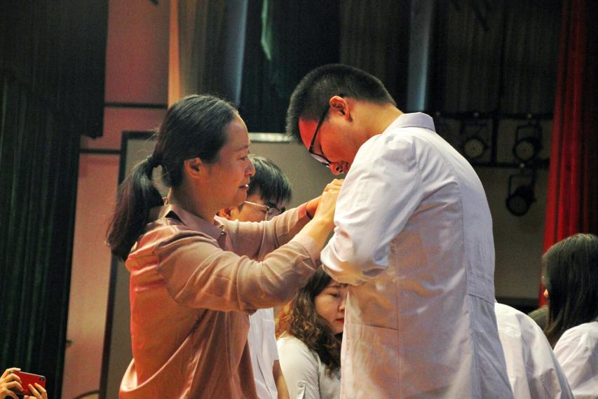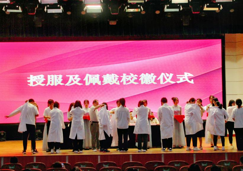 典礼最后,分院的教授、副教授、博士教师上台为为新生代表们授服和佩戴校徽。授服是专业特色的重要体现,凝聚着专业的标准与规范,传递着专业的尊严和行业信息,授服仪式也满含着老师们对同学们殷切的期望。