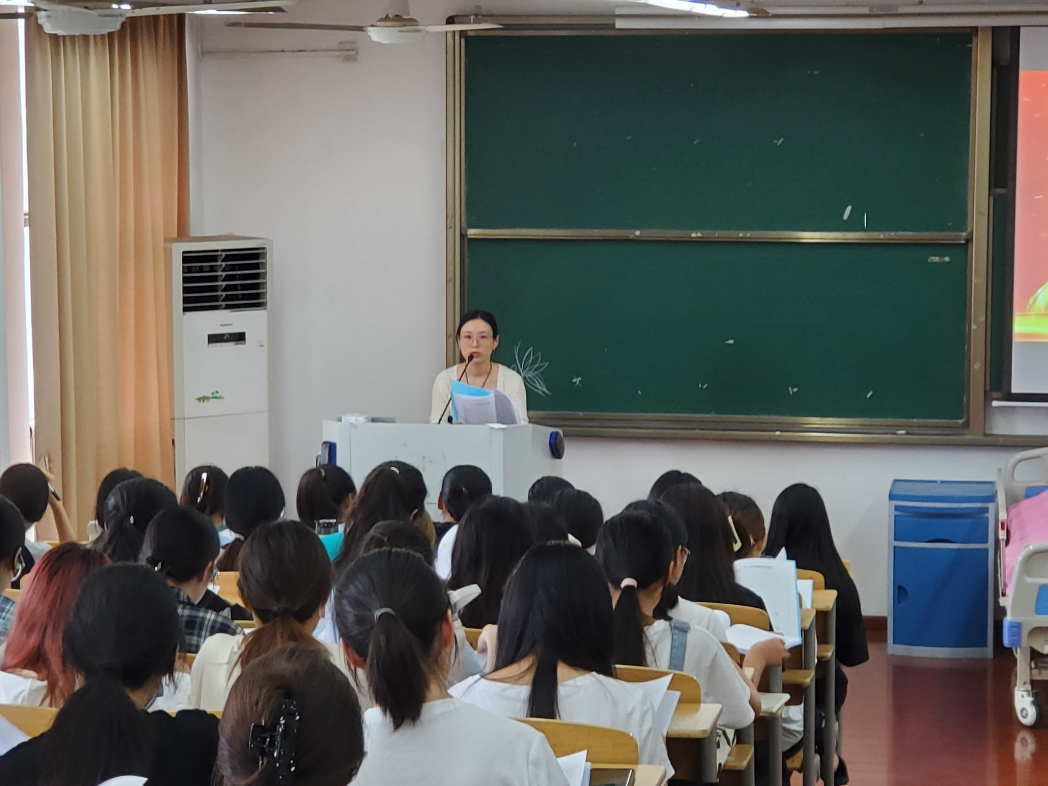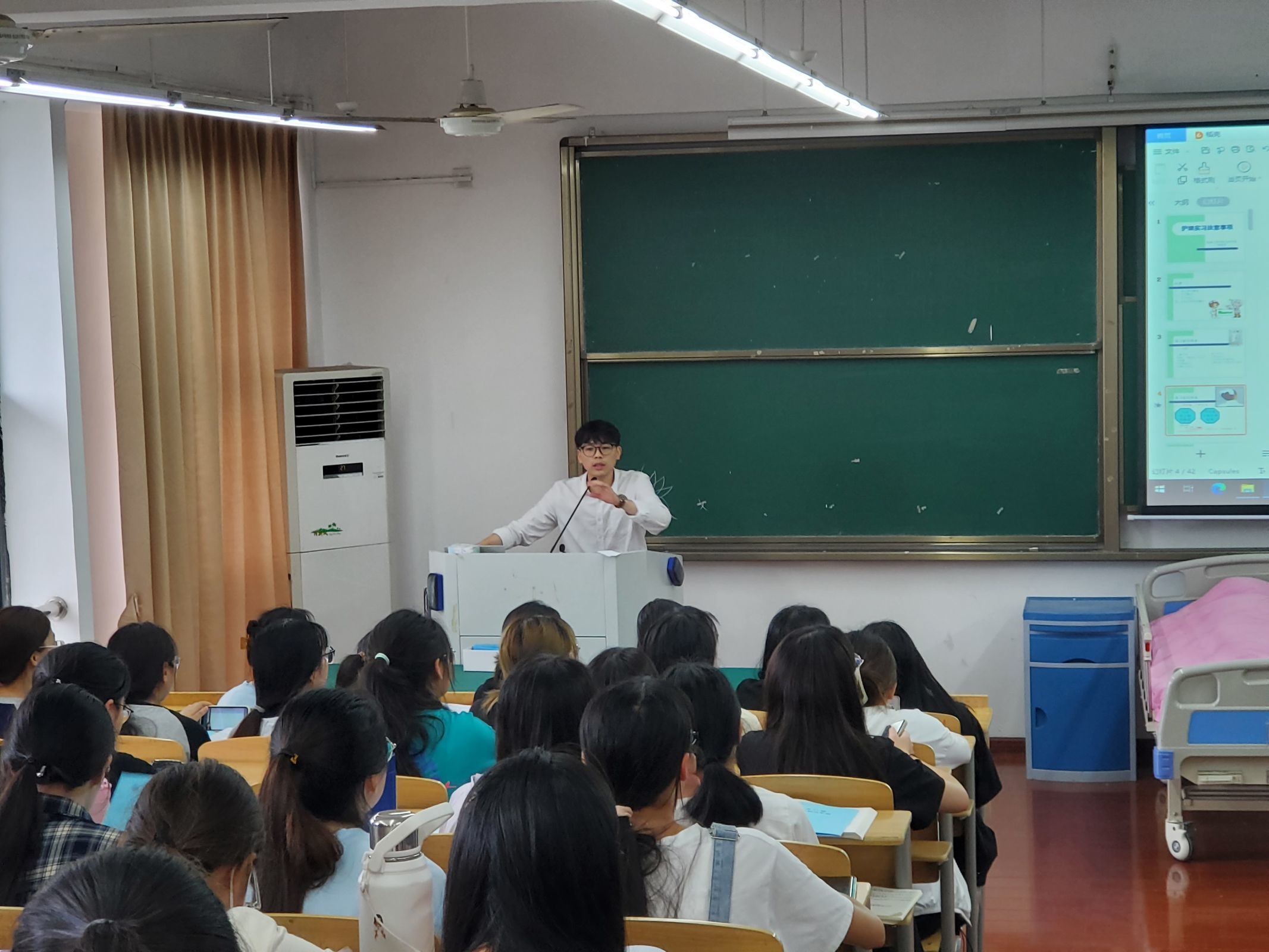 会中护理学专业教师何振华和窦凤娇老师对实习手册的考核与书写进行了讲解,并从用物准备、个人准备、时间观念以及自身防护出发,向大家介绍教学实习过程中的注意事项。