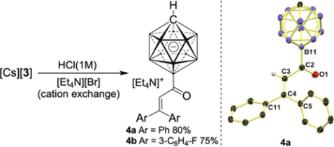 随后,利用中间体2与二苯基甲酮反应,成功合成了一系列碳硼烷基炔丙醇衍生物3。进一步通过加入盐酸,经过Meyer-Schuster重排,生成目标产物—α,β-不饱和羰基化合物4。这一反应过程展示了碳硼烷阴离子在构建复杂有机分子中的潜力,为相关领域的研究提供了新的思路。