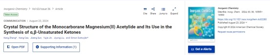 日前,医药与健康分院张康博士在国际著名期刊Inorganic Chemistry (JCR Q1, 中科院1区,Top期刊,NI期刊,南大版学科卓越期刊)上发表了题为“Crystal Structure of the Monocarborane Magnesium(II) Acetylide and Its Use in the Synthesis of α,β-Unsaturated Ketones”的研究论文,这是我院首次以绍兴文理学院元培学院为第一单位,在南大版学科卓越期刊上成功发表的学术成果,标志着我院科研实力和学术影响力的又一次重要突破。