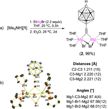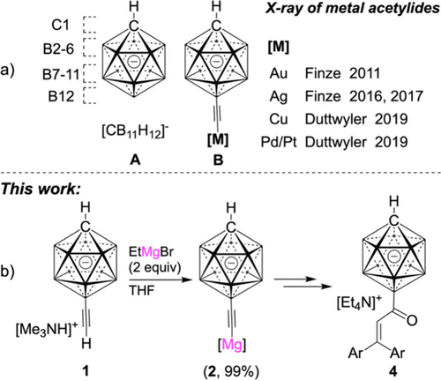 首先,以炔基碳硼烷1为原料,与格式试剂EtMgBr反应,生成碳硼烷炔基镁中间体2,并通过核磁和单晶衍射首次解析其结构。这一研究首次报道了碳硼烷炔基镁的单晶结构,为该类化合物的结构研究提供了重要参考。