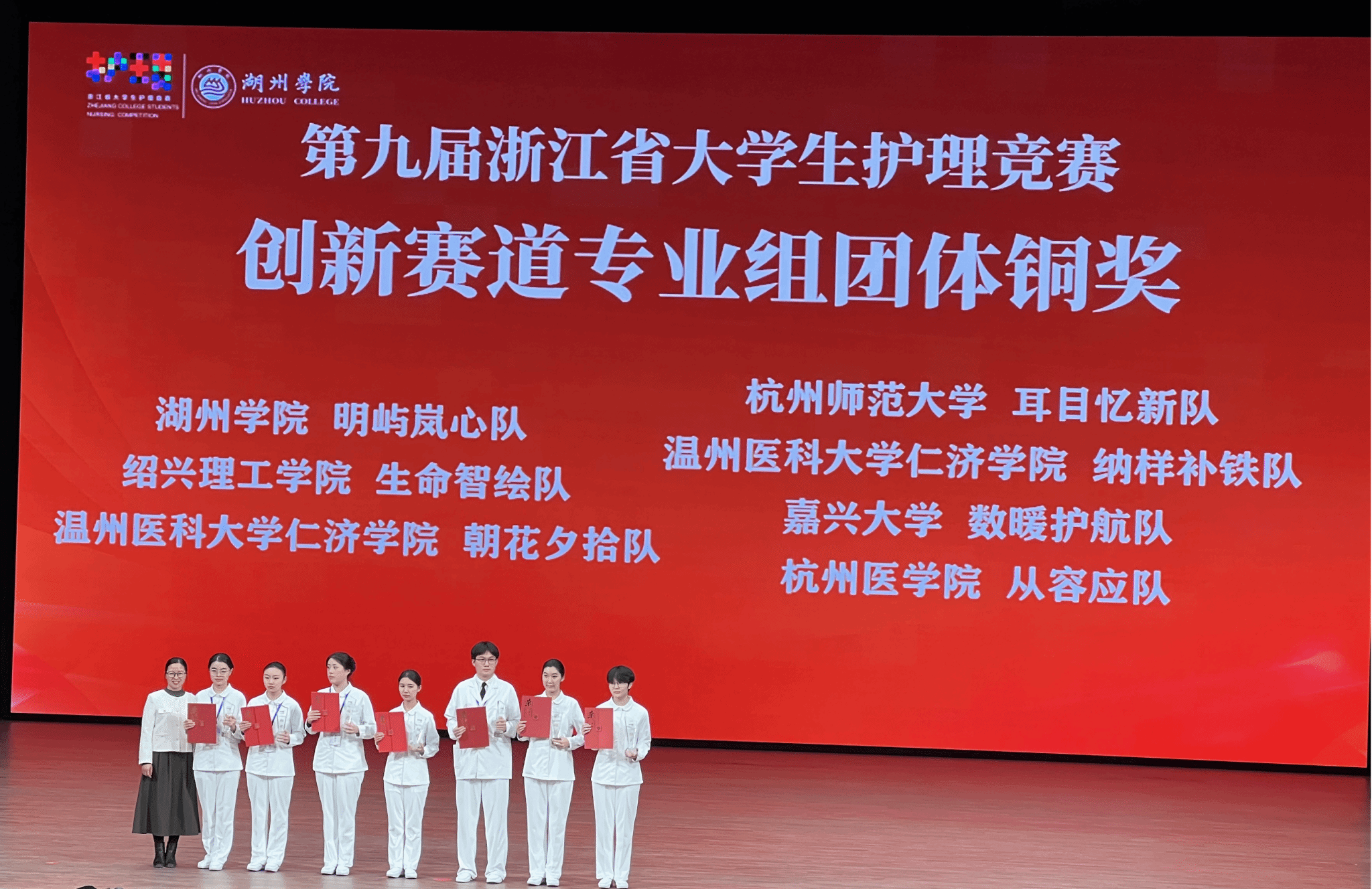 12月5日至6日,第九届浙江省大学生护理竞赛在湖州学院圆满落幕。本次竞赛以“数智领航,护佑健康”为主题,吸引了全省16所高校84支代表队同台竞技。医药与健康学院高度重视,周瑾院长带队,护理学教研室副主任何振华博士、张再洋主任医师、黄聿昕博士以及任娄涯老师作为指导老师陪伴学生备赛和比赛全程,本次竞赛我院共派出3支队伍,参加技能赛道(护理技能组)、创新赛道(专业创新组)等其中两个竞赛项目。经过与其他本科高校的激烈角逐,我院代表队斩获“一银一铜”的优异成绩,创造本次竞赛绍兴地区本科护理院校最佳成绩,这也是新发展征程中的绍兴理工学院护理学专业办学质量的充分体现。