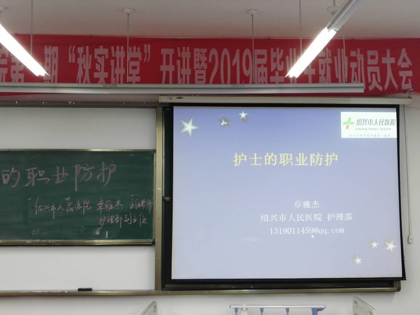 11月21日,医药与健康分院在教学楼10-303开展了“护士的职业防护”专题讲座,由绍兴市人民医院护理部副主任,章雅杰主任护师主讲,护理专业全体学生参加此次讲座。