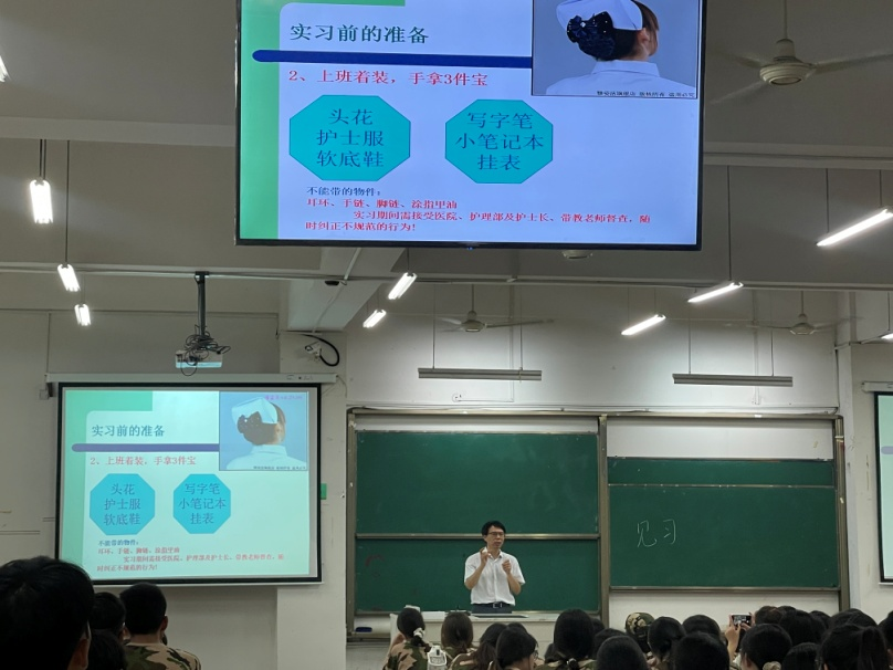 张再洋老师提出了见习的准备,要求任务以及安全问题,他建议见习需要尽量少做操作,与此同时,在见习过程中需多看多想多问,及时做好记录,着装上穿戴好护士服。在操作上,他指出需在带教老师领导下正确操作,在见习期间有问题第一时间与带教老师沟通,操作时需带好口罩,做好个人防护。最后,他也对同学们此次见习充满殷切期望。